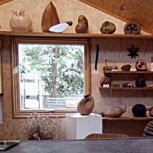Cet atelier de 30 m2 est un espace de création permettant de montrer mes sculptures, de travailler à l'aise avec le ciel au dessus de la tête et de recevoir des amis et des stagiaires. 8 mois de travail avec l'aide de ma famille et de mes amis ont permis la construction du zome. Je l'aime énormément, il sent bon le mélèze et est toujours lumineux. On s'y sent bien grâce à son architecture ronde en facettes.